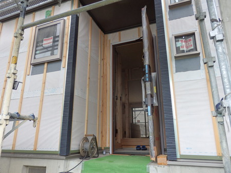 玄関ドアも取り付けられ、外壁の透湿防水シートが貼られています。この後、外壁のサイディング工事が始まります。